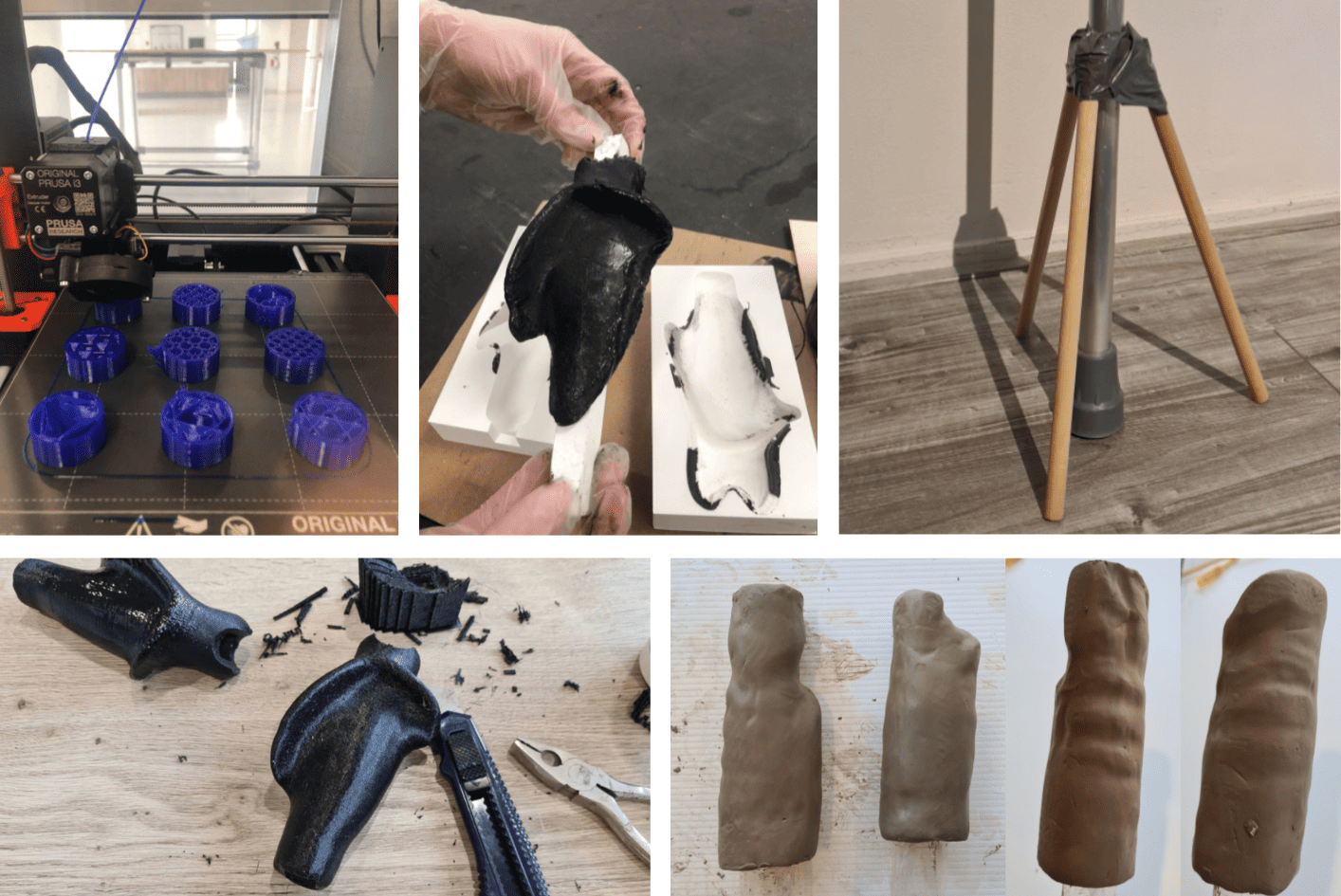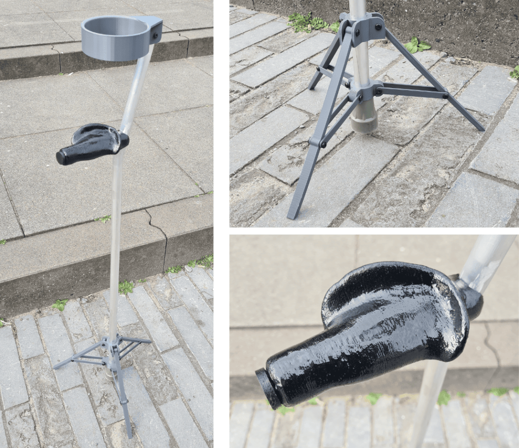 While making the crutch, I focused on experimenting and testing. Developing the handgrip, in particular, involved a lot of trial and error. I created a mold and cast it with polyurethane, as well as 3D printed it using TPU. TPU quickly showed promising results, and after testing different printer settings, I successfully printed a functional handgrip, which I later smoothed using a heat gun. Additionally, I completed two iterations of the stand, which was inspired by a music stand.