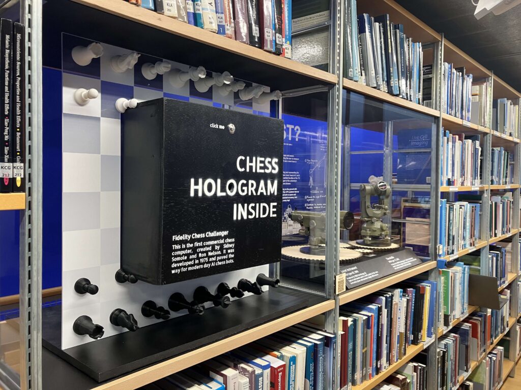 This exhibition features two displays connected by the theme “Lost” and can be visited in the TU Delft Library. One display showcases instruments from the “lost faculty” of Geodesy, including a theodolite on a motorized pedestal with interactive information about land surveying. The second display highlights a chess challenger in a “magic box,” featuring a holographic chess game that reflects the simplicity lost to modern AI. Both displays incorporate interactive and tactile elements to engage visitors