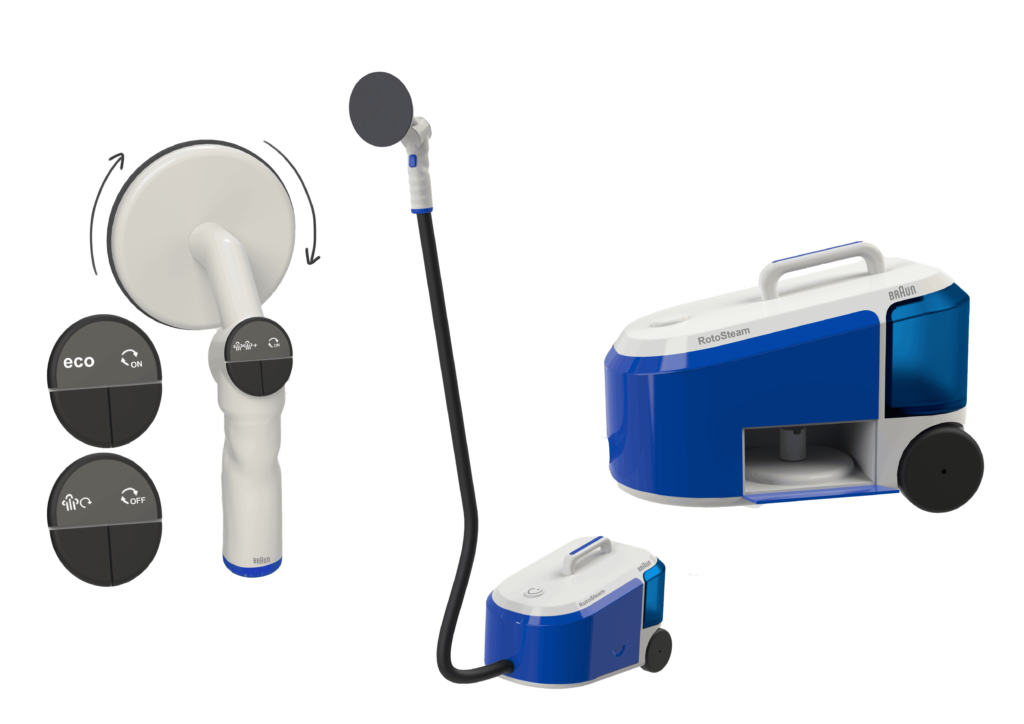 RotoSteam is a floor-standing steam cleaner with an ergonomically designed handgrip developed using 3D scanning technology. To ensure efficient and effortless cleaning, the steam gun features a unique rotating mechanism, which serves as a key selling point. The RotoSteam also includes an iMode function, allowing users to switch between different rotation modes. Additionally, the steam cleaner is compact and equipped with convenient storage for attachments.